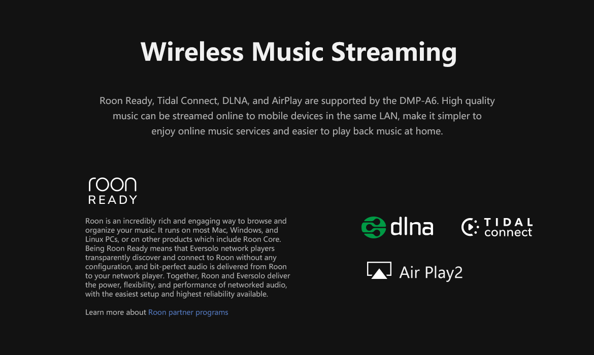 > Streaming: Air Play, DLNA, Spotify, Tidal Connect, Qobuz Connect etc.