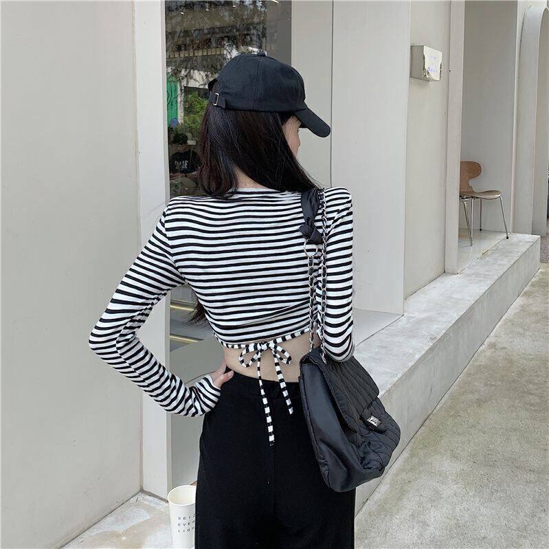 条纹T恤长袖彩色凹凸短款上衣
