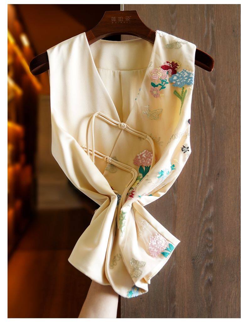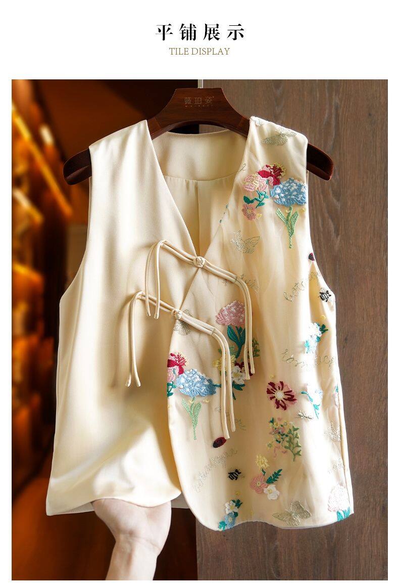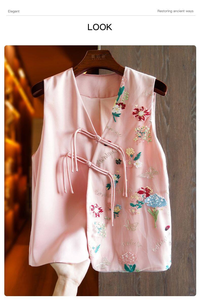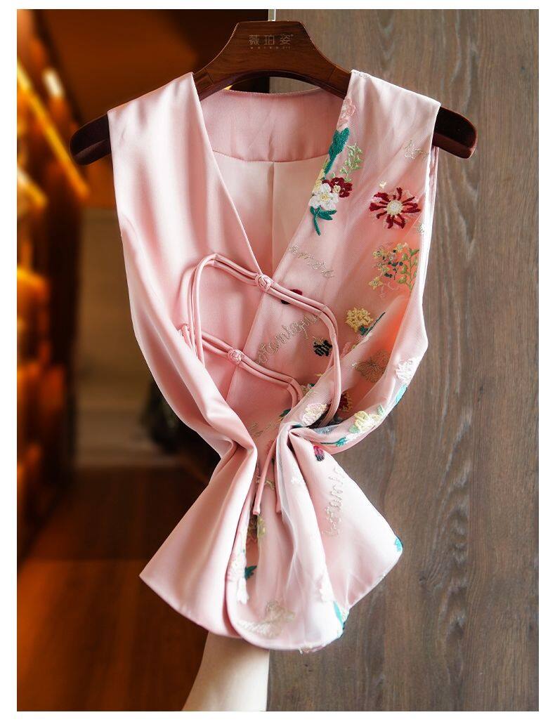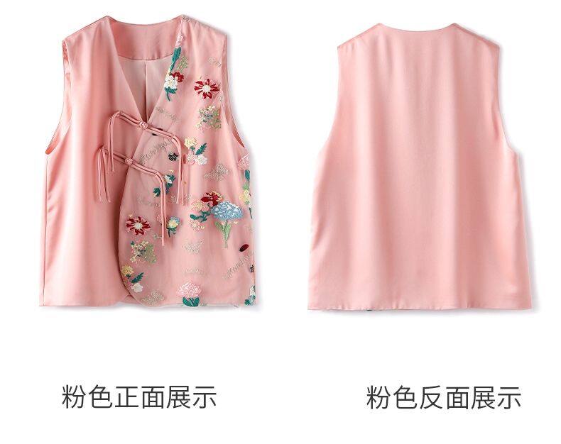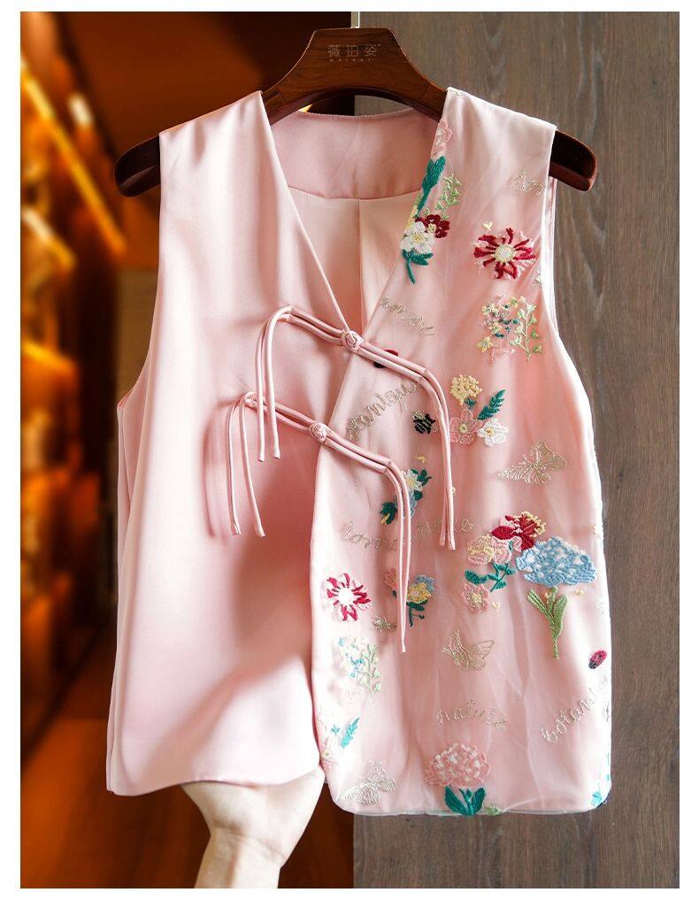 Joso杏粉色高级夏季感中式背心女式夏装原创设计网眼刺绣乡村风板扣上衣